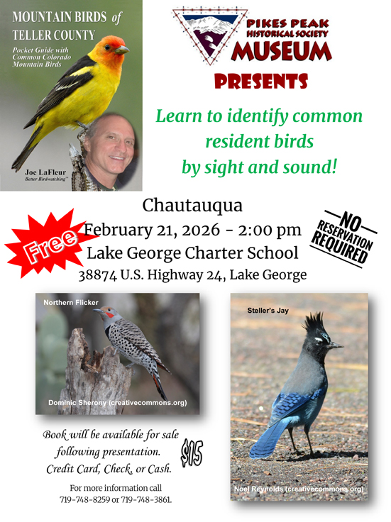 Learn to identify common resident birds of Teller County by sight and sound. Chautauqua presented by Pikes Peak Historical Society.